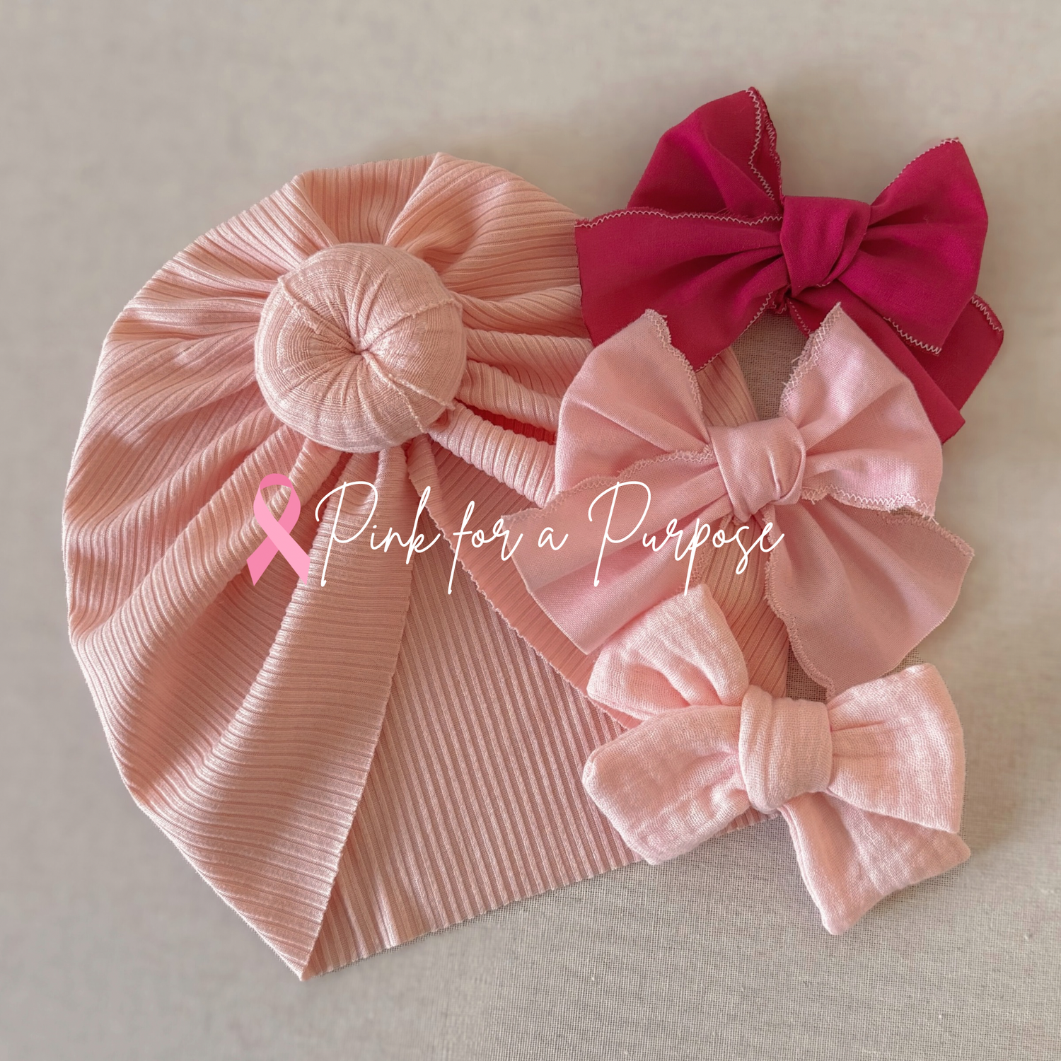 The Pink for a Purpose Collection is more than handmade bows and turbans. It’s a tribute to the women we’ve lost, the survivors who carry on with courage, and the fighters still in their journey. Created with love and meaning, each piece is stitched in pink as a symbol of strength, remembrance, and hope. We wear pink not just for awareness, but for the stories, the strength, and the women who inspire us all.