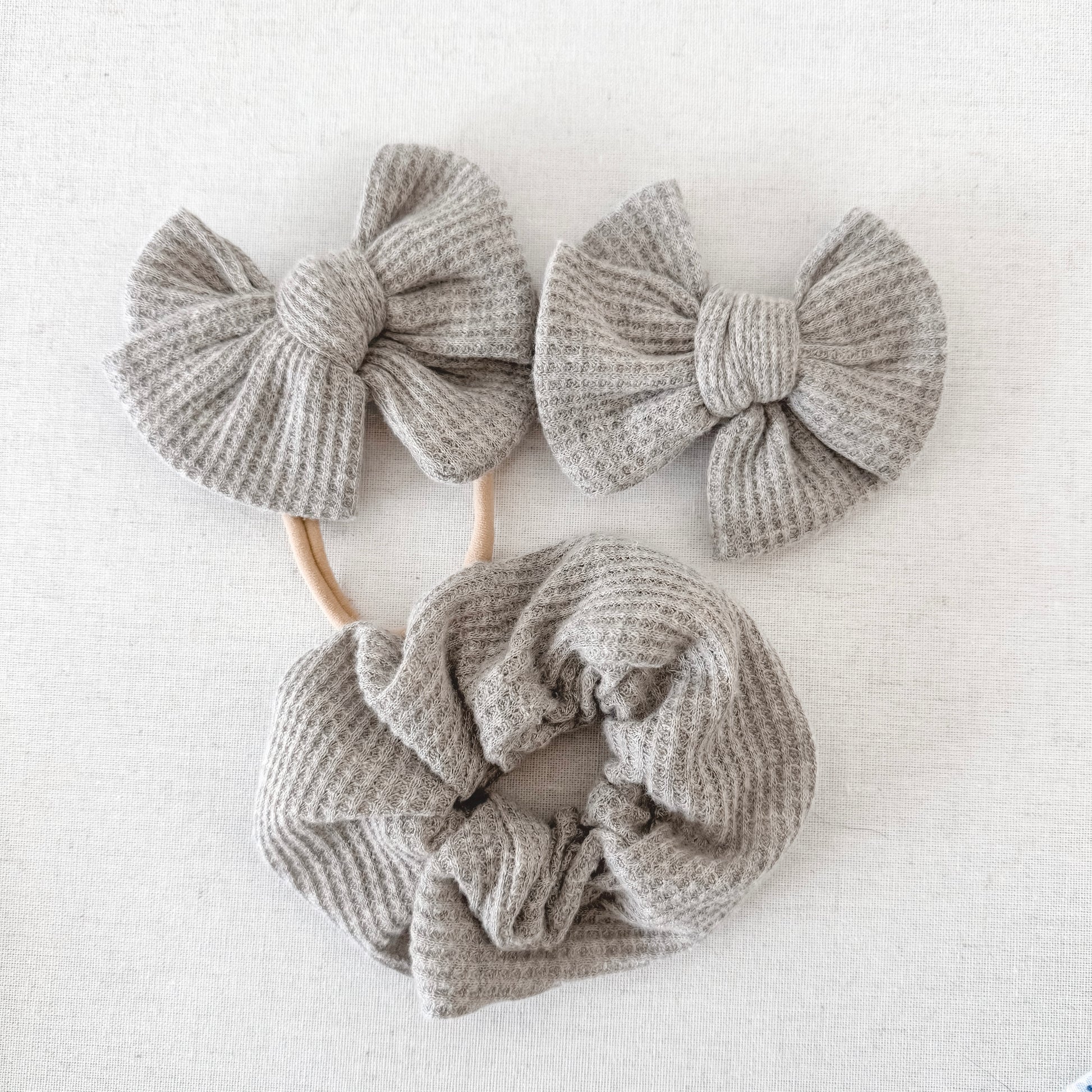 A cozy textured waffle knit scrunchie in a soft gray tone. Easy, neutral, and perfect for everyday wear. Matches our Dove classic bow for littles.