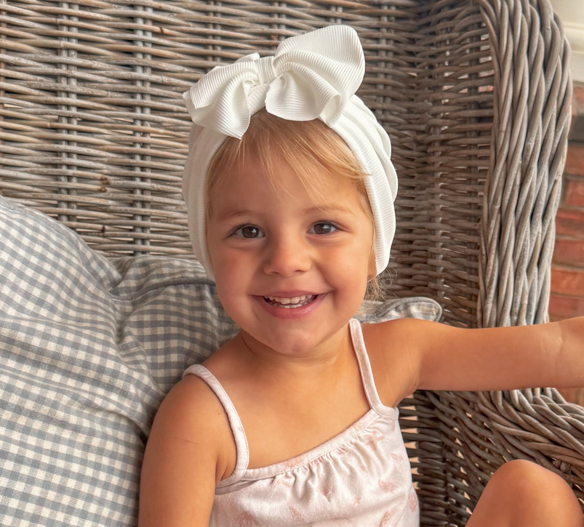 Our Little Cloud turban is made from stretchy white ribbed knit, simple and versatile with a clean, cozy finish that pairs beautifully year-round.