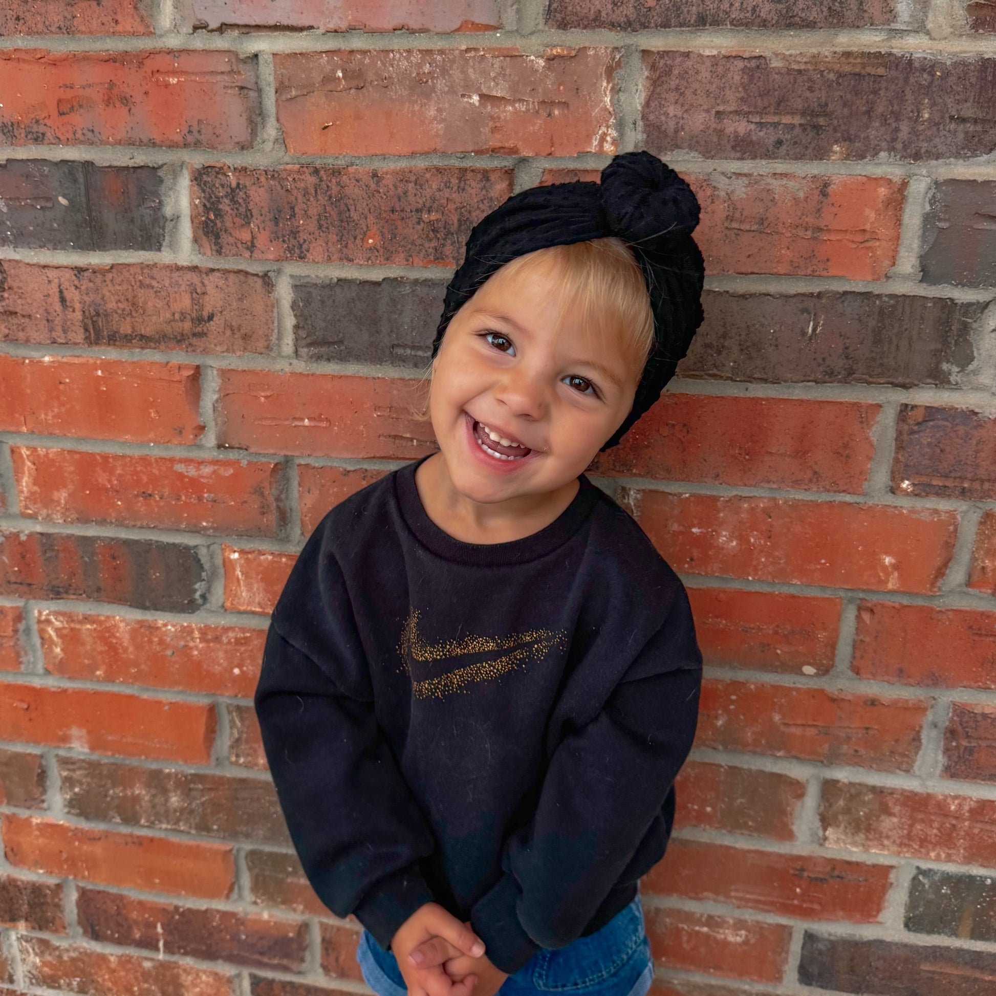 Our Midnight Snuggles turban is made from soft black dimple dot, a plush textured fabric with raised dots that’s perfect for cozy snuggles.