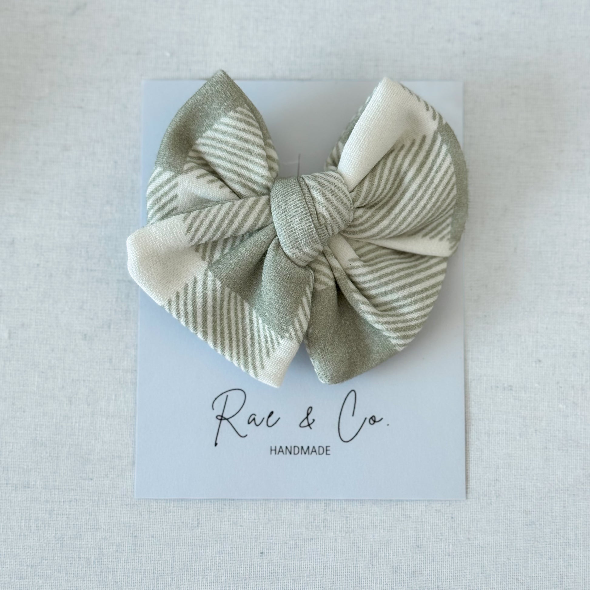 A soft sage and white plaid bow that feels effortlessly festive and timeless. Available in clip or headband style.