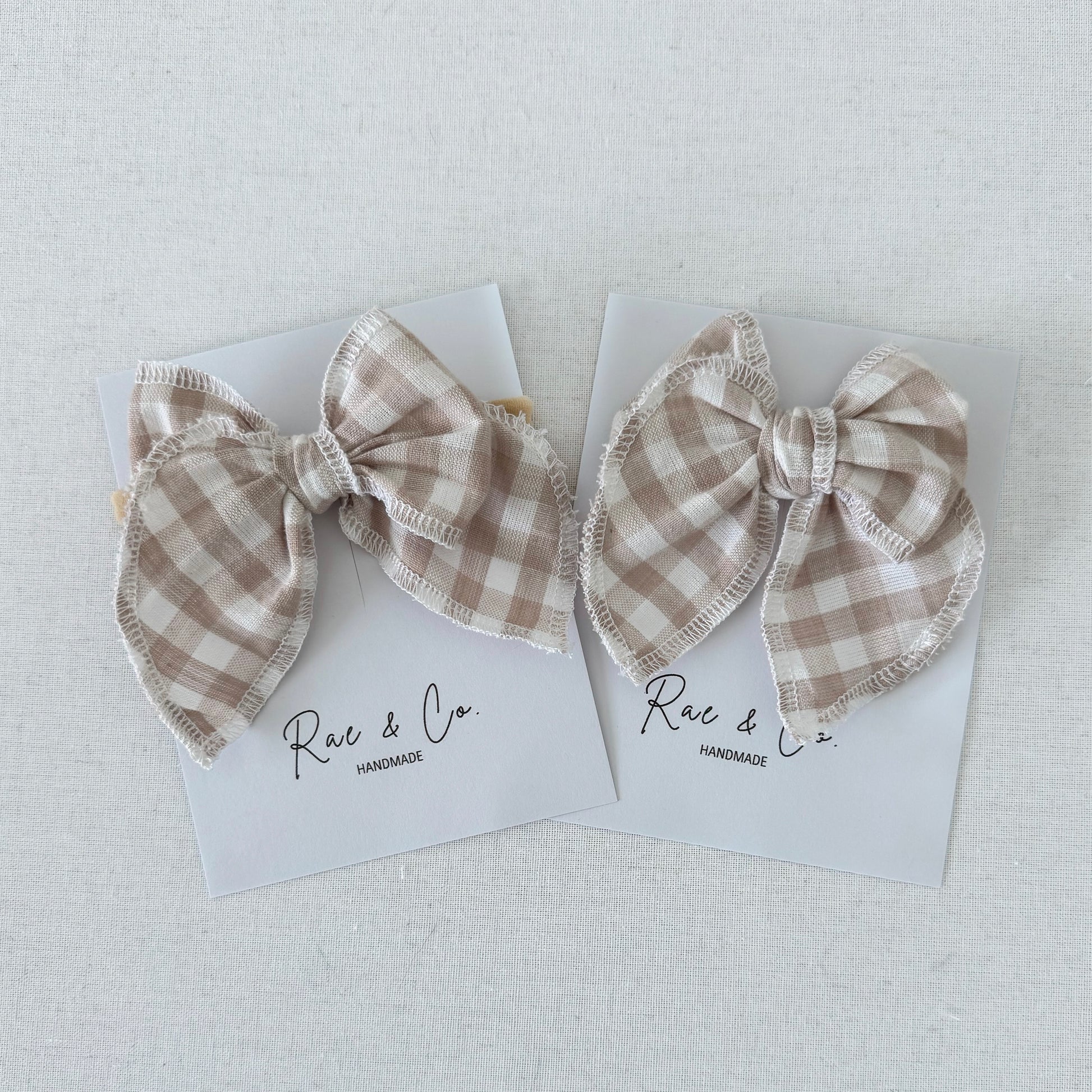 Soft beige gingham bow- playful, cozy, and endlessly versatile. Available in clip or headband style.